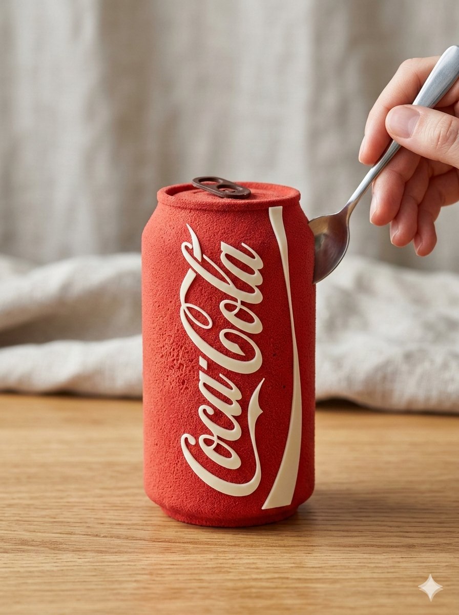 超现实可食用版本的[上传产品],保留精确的原始形状、比例和轮廓,产品完整无损,表面转化为[柔软哑光慕斯]
