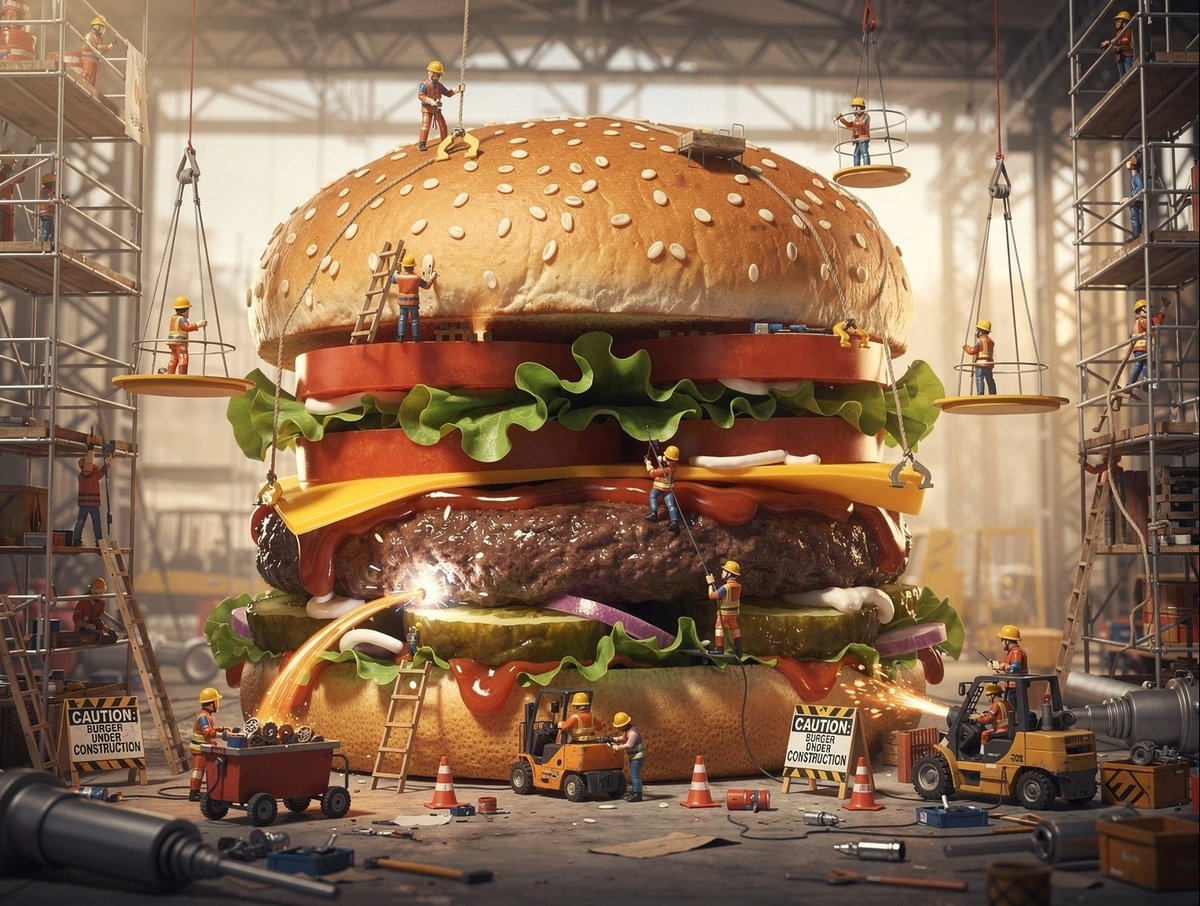 生成产品摄影场景,其中产品由微型工人和设备建造或维护,呈现出工业而又有趣的幕后概念。它捕捉了团队协作的施工中叙事。