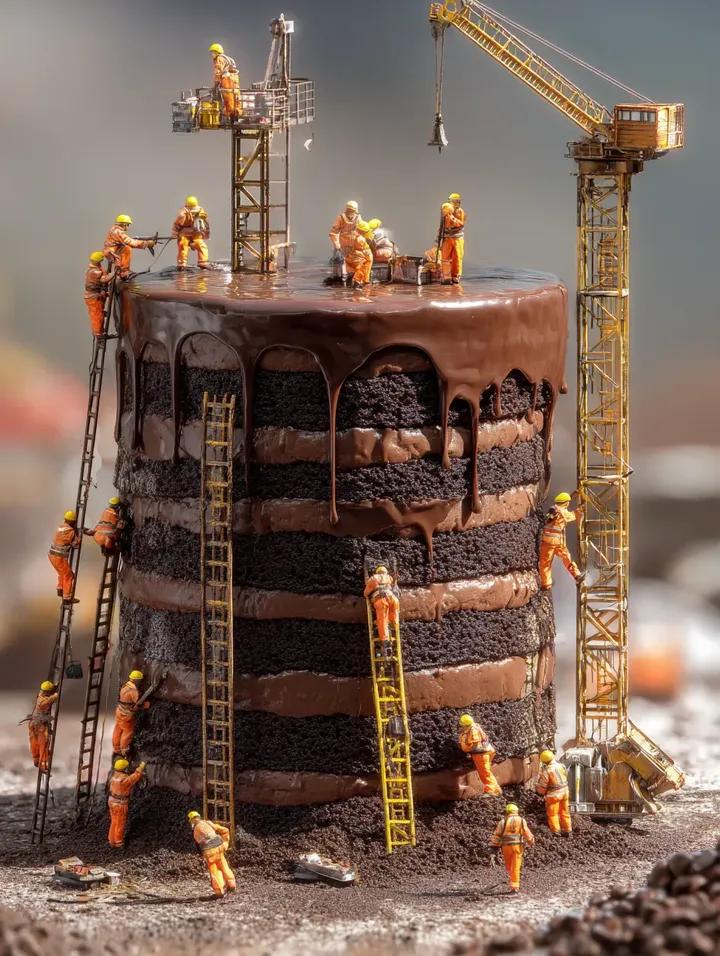 此提示生成一幅超现实的巨型巧克力层蛋糕图像,高耸如摩天大楼,由微型建筑工人层层搭建。场景强调精细的细节和奇幻的比例。