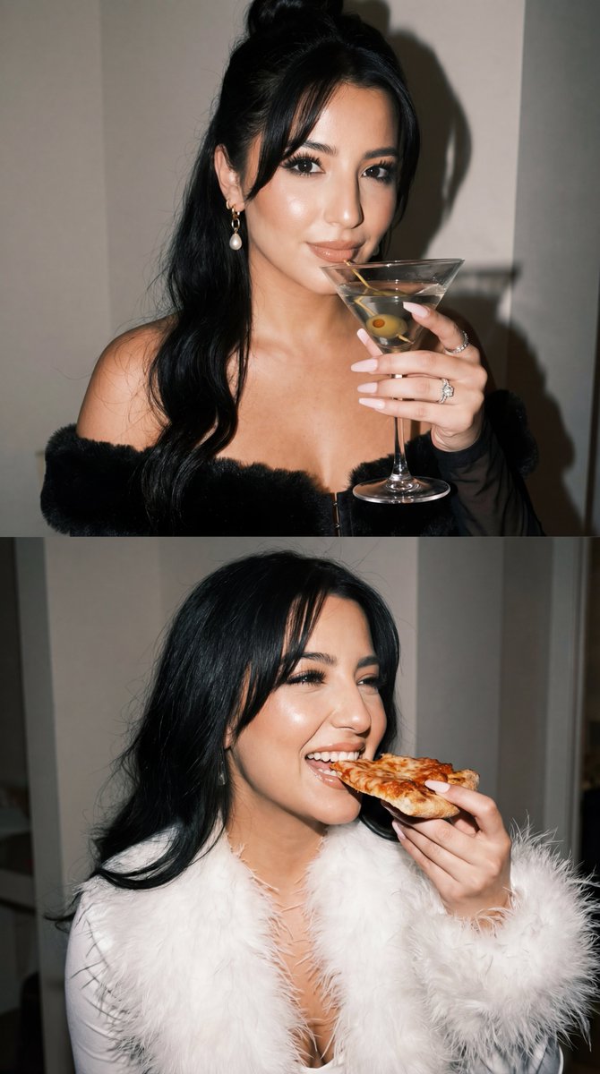 "scene_summary": "创建一个两面板垂直拼贴(2x1)。两个面板中是同一位女性(身份锁定到插槽 1)。高端派对时尚编辑风格,带机内闪光灯,逼真的抓拍感。使用风格参考:面板 1 匹配黑色皮草 + 马提尼酒的氛围;面板 2 匹配白色羽毛 + 披萨的氛围。无额外人物,无文字。",