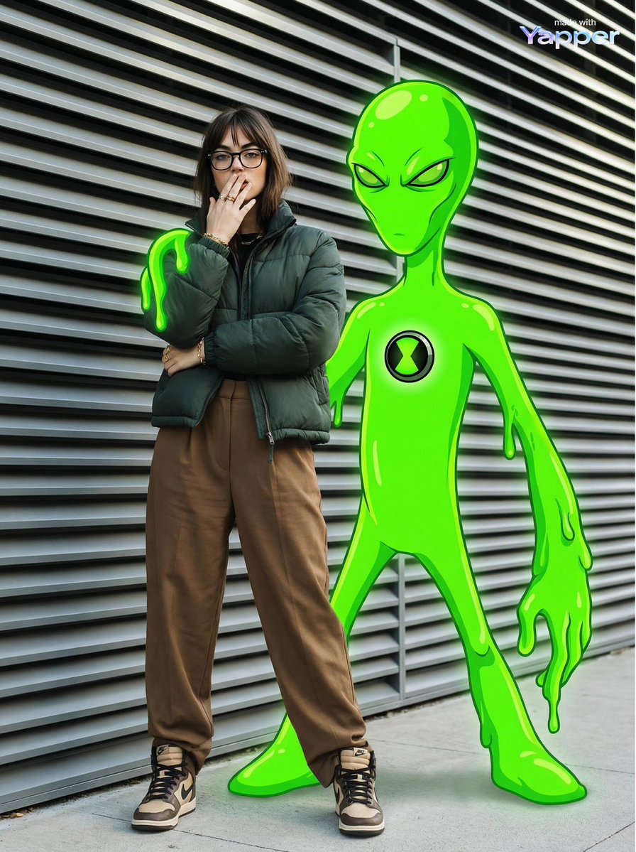 一位时尚的年轻女性站在户外,背景是现代的[灰色金属百叶窗]墙,穿着一件[深绿色]羽绒服,黑色衬衫,宽松的[棕色]阔腿裤,以及[耐克]靴子。她有[黑色]头发,戴着眼镜,并且遮挡了一部分