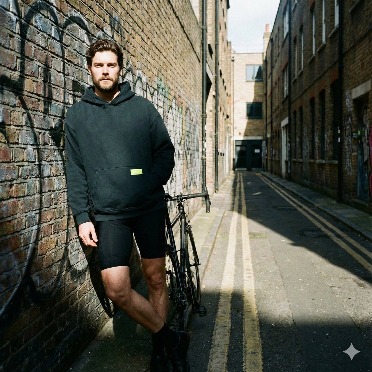 [独行骑行者] 靠着一面 [涂鸦砖墙],自行车在旁边,穿着 [超大连帽衫和骑行短裤],口袋上有一个微妙的 [霓虹石灰色] 补丁。 [狭窄的英国小巷],刺眼的阳光穿透其中,强烈