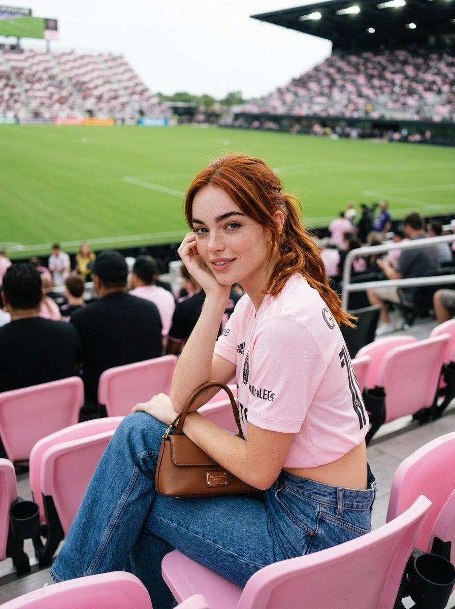 制作一个逼真的年轻女性,她有浅色雀斑和[红色]头发,扎着低马尾,坐在[粉色][体育场座位]上,穿着[粉色]足球球衣露脐上衣和牛仔裤,手持一个棕色小[设计师手袋],休闲风格