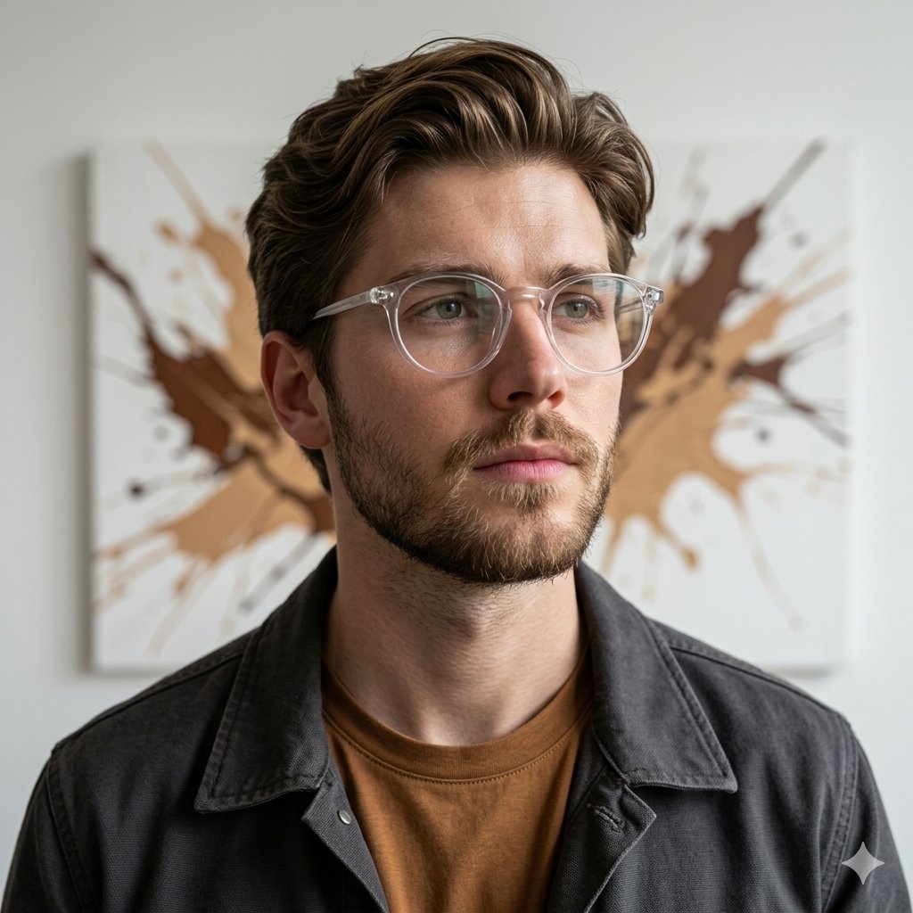一个电影感、超现实的特写肖像,描绘一个留着波浪形、造型过的[棕色]头发和修剪整齐胡须的[年轻男子]。他戴着透明边框的圆形眼镜,略微偏离镜头,表情若有所思。他穿着一件[深炭灰色]帆布夹克,内搭一件[烟草色]T恤。背景是一面简约的画廊墙,上面挂着一幅带有动态棕色和棕褐色飞溅颜料的[现代抽象艺术品]。自然柔和的侧光突出了面部纹理和眼镜上的反光。8k分辨率,照片级真实感,浅景深。