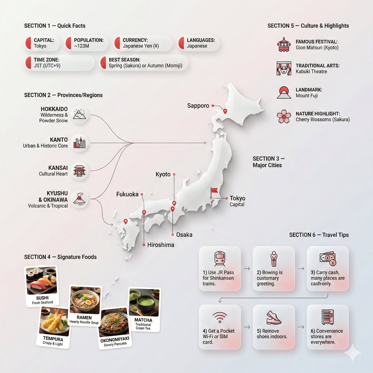 此提示生成一张超干净、现代的特定国家信息图海报。它结合了高级编辑布局和生活方式旅行摄影美学。